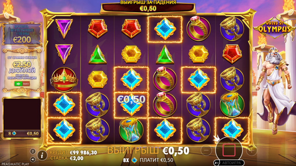 В отличие от классических слотов с линиями выплат, Gates of Olympus использует механику Pay Anywhere. По нашему опыту — это кардинально меняет игровой процесс. Здесь не нужно выстраивать символы по линиям или соседним ячейкам. Для получения выплаты достаточно собрать 8+ одинаковых символов в любом месте игрового поля. Каскадные выигрыши (Tumble Feature) делают геймплей невероятно динамичным — выигрышные символы исчезают, а новые падают на их место, позволяя получить несколько выигрышей за один спин.